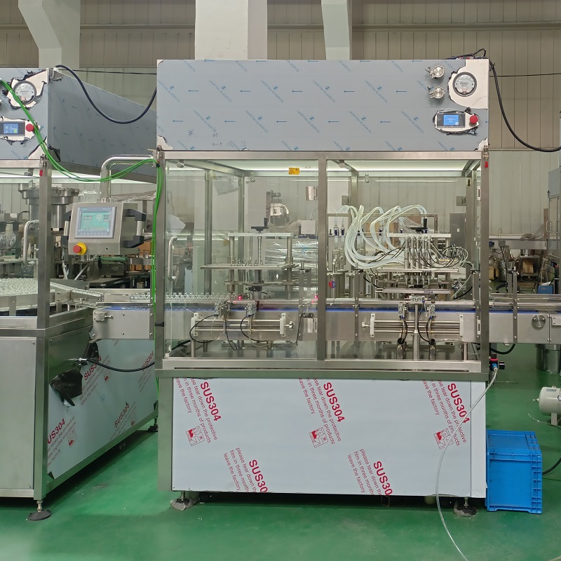 本設(shè)備是液體生產(chǎn)線中的灌裝旋蓋主機,主要用于玻璃瓶或塑料瓶的理瓶、灌裝、上蓋、封口、貼標打碼等,采用直線式或者圓盤定位式灌裝,電磁振動送蓋,升降式旋蓋,立式貼標打碼,具有無瓶不灌,無瓶不上蓋,無瓶不貼標,無瓶自動停機等功能,該生產(chǎn)線中灌裝和旋蓋合二為一,結(jié)構(gòu)緊湊,符合GMP標準。