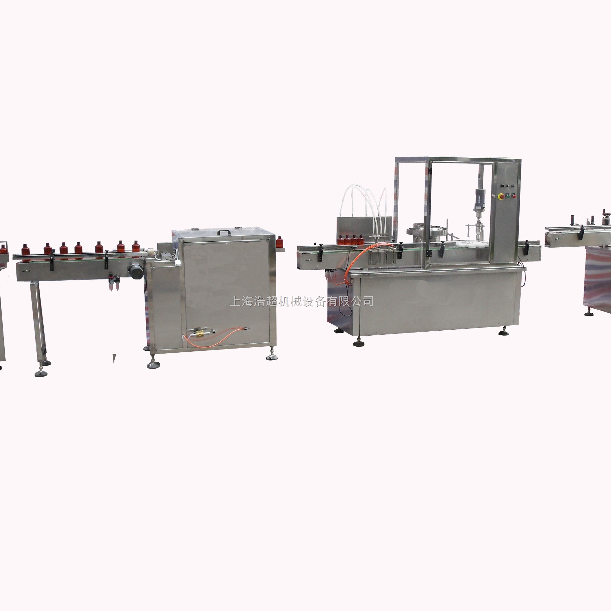 本生產(chǎn)線由供瓶機,滾筒式洗瓶機、隧道式烘箱(選配)、灌裝加塞機、圓盤定位旋(軋)蓋機組成,可完成超聲波、水、氣的清洗、烘干、灌裝、加塞、軋蓋等工序,主要用于大輸液及其他小劑量溶液的聯(lián)線生產(chǎn),并可配以貼標機組成合理的生產(chǎn)線。本生產(chǎn)線設(shè)計合理,操作簡單,易于維護,符合GMP要求。