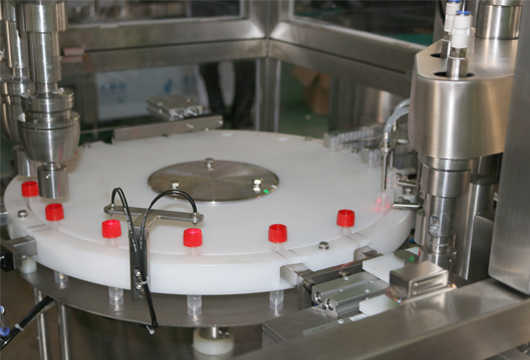 工作流程:該機(jī)通過螺桿把包材送到主機(jī)卡位上,然后光標(biāo)檢測定量灌裝,充填后會定位進(jìn)行上蓋、下蓋,再進(jìn)行旋蓋。后通過機(jī)械手或者推桿把包裝后成品推出盛料處。