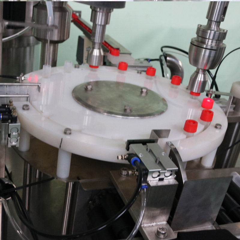工作流程:該機通過螺桿把包材送到主機卡位上,然后光標檢測定量灌裝,充填后會定位進行上蓋、下蓋,再進行旋蓋。后通過機械手或者推桿把包裝后成品推出盛料處。
