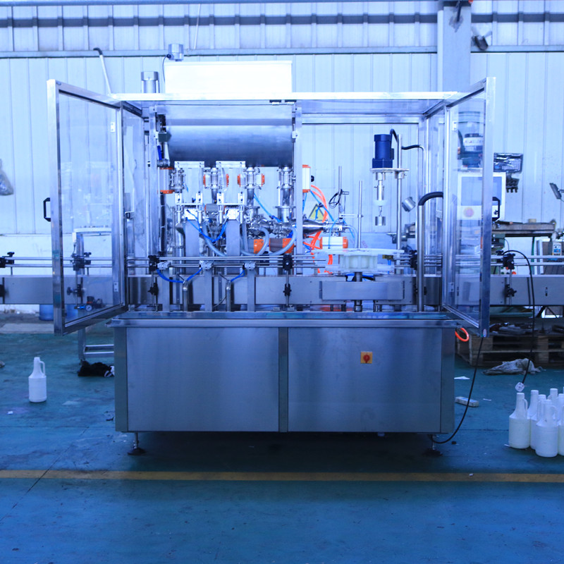 該機(jī)灌裝和旋(軋)蓋合二為一,設(shè)計合理,結(jié)構(gòu)緊湊,符合GMP標(biāo)準(zhǔn)。電氣元件采用知名品牌。本機(jī)操作直觀方便,無瓶不灌裝。全自動旋(軋)蓋,保證封口的牢固、美觀。