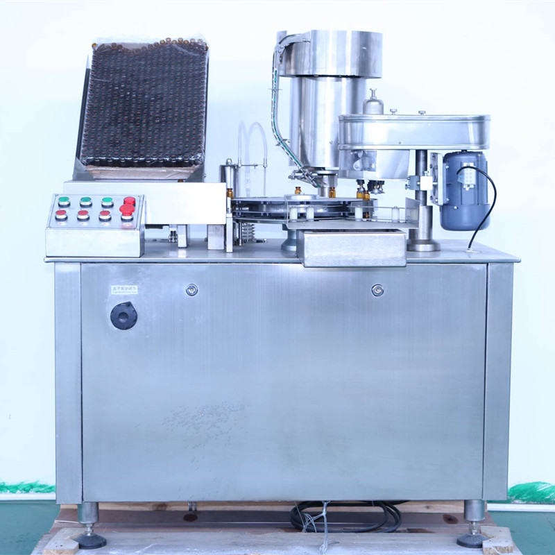 本機(jī)為10-20ML的口服液灌裝封口而設(shè)計,是口服液灌裝生產(chǎn)線中的灌裝主機(jī),用于易拉直管瓶的灌裝、上蓋、封口。采用注射泵灌裝,電磁振動自動送蓋,三刀離心式軋蓋(或旋蓋),具有無瓶不灌裝的功能。該機(jī)灌裝和封口合二為一,結(jié)構(gòu)緊湊,易于操作與維護(hù),符合GMP標(biāo)準(zhǔn)。
