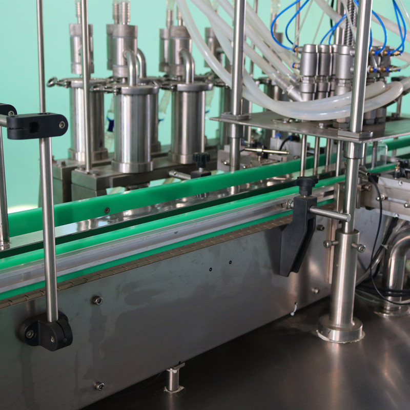 由供瓶、灌裝、上內(nèi)塞、外蓋、旋蓋、貼標等主要部分組成。通過全自動理瓶機或供瓶機把瓶子輸送到光眼檢測處,然后進行灌裝,震蕩盤理蓋上蓋后旋蓋,工序完成后可加貼標機、打碼機,再送出到收瓶機。