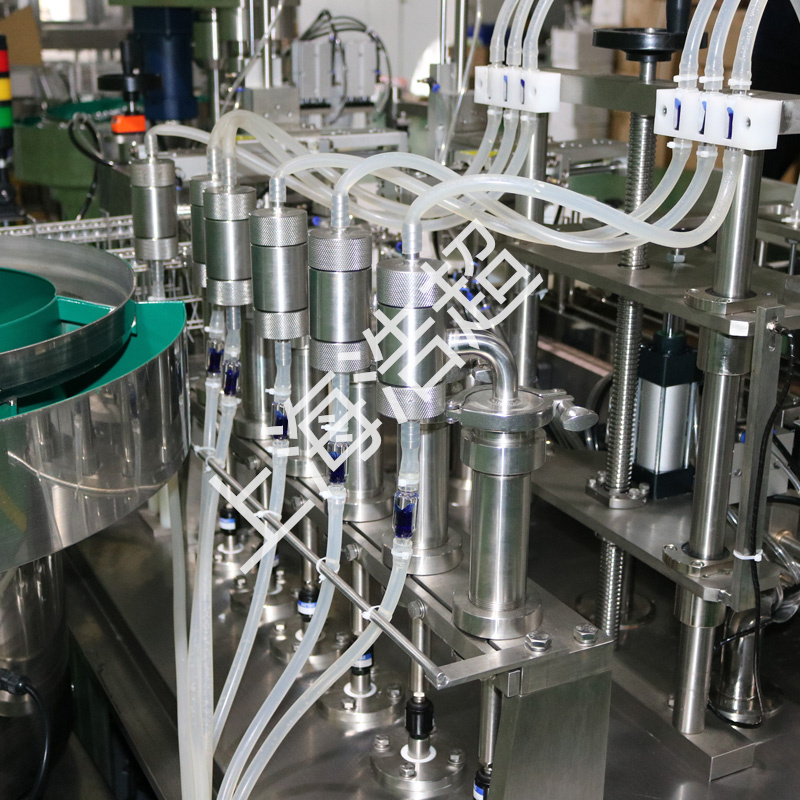 由供瓶、灌裝、上內(nèi)塞、外蓋、旋蓋、貼標(biāo)等主要部分組成。通過全自動(dòng)理瓶機(jī)或供瓶機(jī)把瓶子輸送到光眼檢測(cè)處,然后進(jìn)行灌裝,震蕩盤理蓋上蓋后旋蓋,工序完成后可加貼標(biāo)機(jī)、打碼機(jī),再送出到收瓶機(jī)。