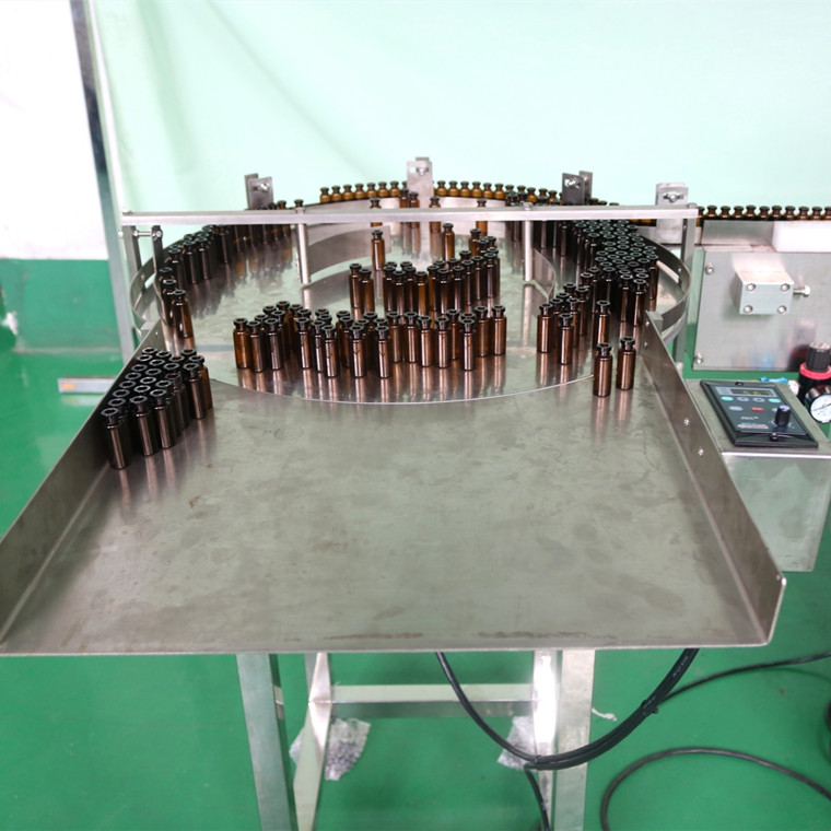 本機為大的塑料瓶及玻璃瓶而設計,通過圓盤的旋轉,把圓盤上凌亂的瓶子有序地供入下一道工序的輸送帶上,并具有緩沖作用。符合GMP要求。