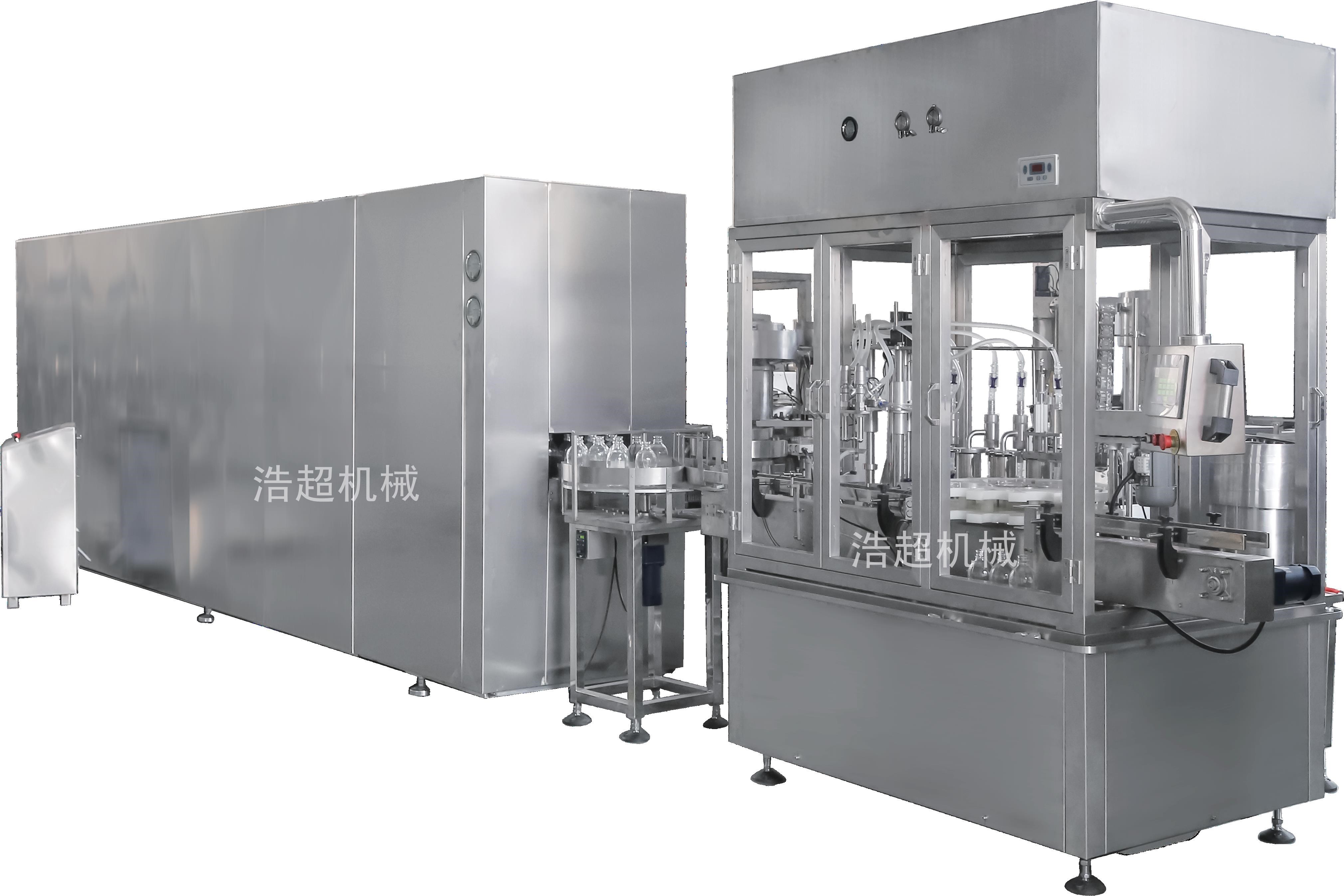 本生產(chǎn)線由洗瓶機、隧道式熱風循環(huán)烘箱、灌裝機、加塞旋(軋)蓋機組成,可完成超聲波、水、氣交替清洗、高溫烘干、灌裝、加塞、軋蓋。貼標等工序,用于大輸液的聯(lián)線生產(chǎn)。