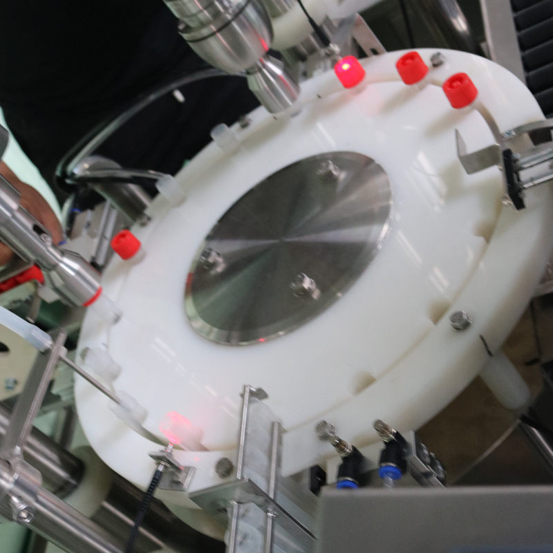 本機是采用磨擦式旋蓋形式,調節(jié)方便,旋蓋速度可根據(jù)用戶產量任意調節(jié),比爪式旋蓋機提高工作效率三倍。本機設計合理,結構緊湊,旋蓋效率高,瓶蓋不打滑破損,瓶體不拉毛,穩(wěn)定可靠,使用壽命長,操作簡單、維修方便。符合GMP規(guī)范要求。廣泛適用于醫(yī)藥、食品、化工等行業(yè)。