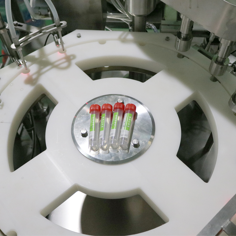 工作流程:該機通過振動盤把包材送到主機卡位上,然后光標檢測定量灌裝,充填后會定位進行上蓋、下蓋,再進行旋蓋。后通過機械手或者推桿把包裝后成品推出盛料處。