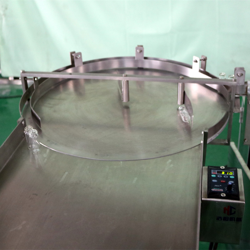 本機(jī)為大的塑料瓶及玻璃瓶而設(shè)計(jì),通過(guò)圓盤的旋轉(zhuǎn),把圓盤上凌亂的瓶子有序地供入下一道工序的輸送帶上,并具有緩沖作用。符合GMP要求。