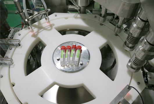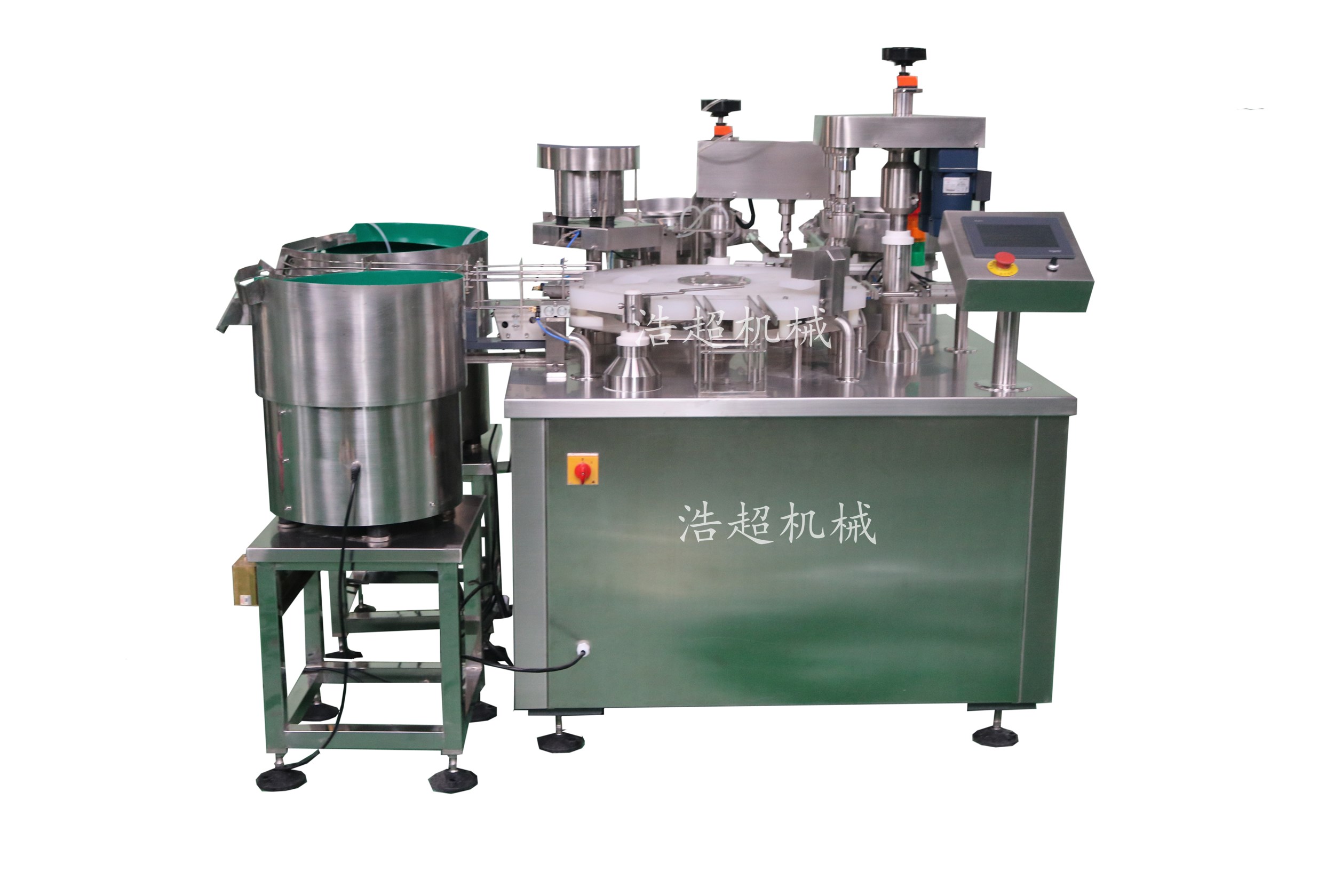 產(chǎn)品概述:本設(shè)備是根據(jù)客戶樣品瓶子定制的液體灌裝旋蓋一體機(jī),主要適用于采樣管的理瓶、灌裝、上蓋、旋蓋,采用振動(dòng)盤式理瓶、蠕動(dòng)泵灌裝,電磁振動(dòng)自動(dòng)送蓋,機(jī)械手臂定位上蓋加預(yù)旋、摩擦式旋蓋或爪式旋蓋,具有無瓶不灌裝、無瓶不上蓋、缺蓋報(bào)警停機(jī)的功能。該設(shè)備把灌裝和旋蓋合二為一,設(shè)計(jì)合理,結(jié)構(gòu)緊湊,易于操作與維護(hù)。