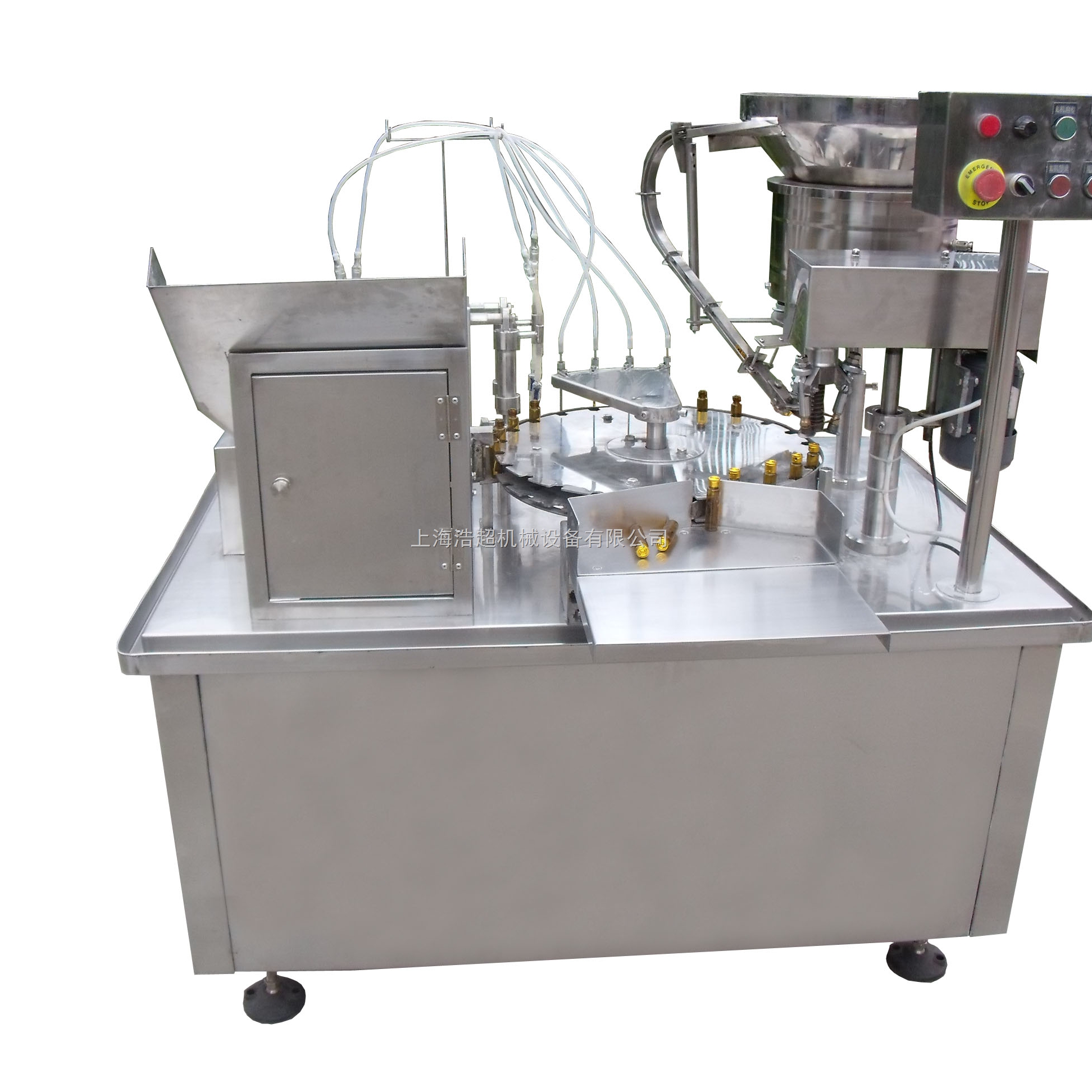本機(jī)為10-20ML的口服液灌裝封口而設(shè)計(jì),是口服液灌裝生產(chǎn)線中的灌裝主機(jī),主要用于易拉直管瓶的灌裝、上蓋、封口。采用柱塞泵灌裝,電磁振動(dòng)自動(dòng)送蓋,三刀離心式軋蓋(或旋蓋),具有無(wú)瓶不灌裝的功能。該機(jī)灌裝和封口合二為一,結(jié)構(gòu)緊湊,易于操作與維護(hù),符合GMP標(biāo)準(zhǔn)。