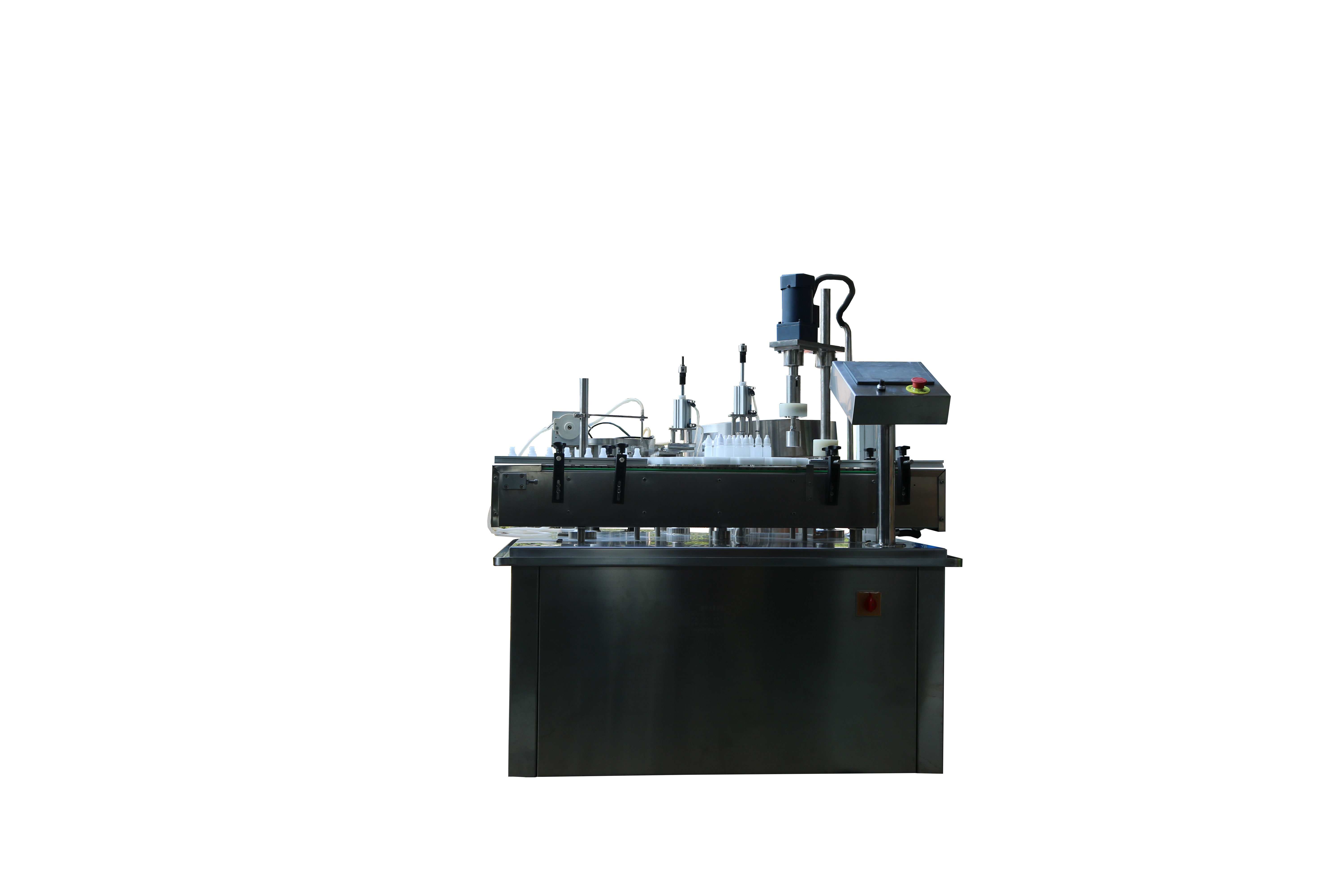 本機適用于2-30ML各種材質(zhì)的圓形扁形塑料或玻璃瓶的眼藥水灌裝.本機由高精度凸輪分度機構(gòu)提供分度等分盤定位上塞上蓋;加速度凸輪傳動提供旋蓋頭的升降;恒扭矩旋蓋;蠕動泵計量灌裝;觸摸屏控制.無瓶不灌裝,不加內(nèi)塞,外蓋.傳動平穩(wěn),保護瓶蓋,操作簡單等優(yōu)點。