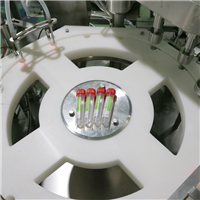 • 診斷試劑灌裝機 全自動灌裝 工作流程:該機通過螺桿把包材送到主機卡位上,然后光標檢測定量灌裝,充填后會定位進行上蓋、下蓋,再進行旋蓋。后通過機械手或者推桿把包裝后成品推出盛料處。